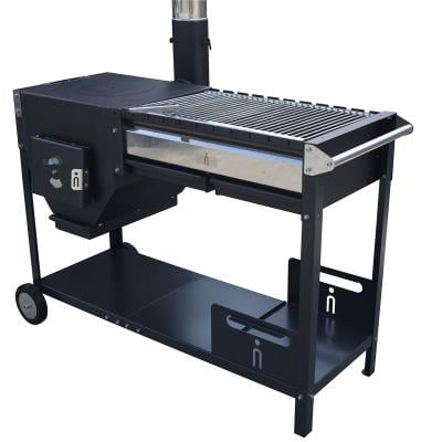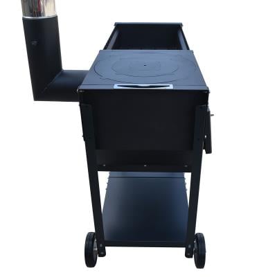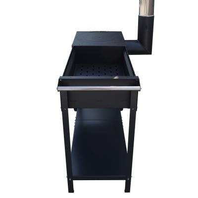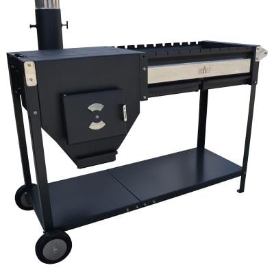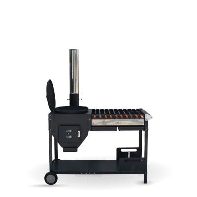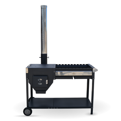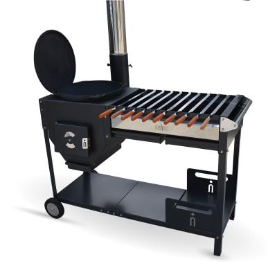 Der Ofen-Mangal vereint alles, was man für die Zubereitung von Speisen über dem Feuer braucht. Ein sehr handliches und kompaktes Modell für Profis und Menschen die gern Speisen in der Natur zubereiten. Die Konstruktion hat zwei Sektionen: das Kohlebecken und den Ofen. Der Ofen hat mehrere Fächer für Töpfe mit verschiedenen Durchmessern. Besonders erwähnenswert ist auch die untere Stahlablage, auf der Brennholz, Geschirr und andere Küchenutensilien untergebracht werden können. Sie können ein Handtuch oder einen Thermohandschuh an den Griff auf der rechten Seite des Grills hängen. Der Griff kann auch zum Transport des des Ofen-Mangals verwendet werden, wofür das Gerät mit kleinen Rädern ausgestattet ist.