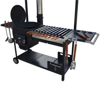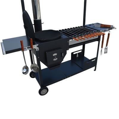 Печь-мангал PREMIUM AIR – представитель премиальной серии частично разборных конструкций. Отличие данной модели – два раскладных стола, на которых можно готовить и расположить кухонные принадлежности. Печь - мангал с казаном и крышей имеет две секции: мангал на 10 шампуров и жаровню под котел на три кольца (больше 390 мм, под емкость объемом 12 л). И под мангалом, и под жаровней есть зольные ящики, куда попадает зола и жир от еды. Кроме того, они помогают регулировать температура и высоту огня. Для комфортного приготовления пищи мангал с печкой оборудован крышей и двумя транспортировочными колесами.