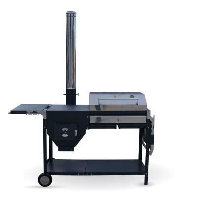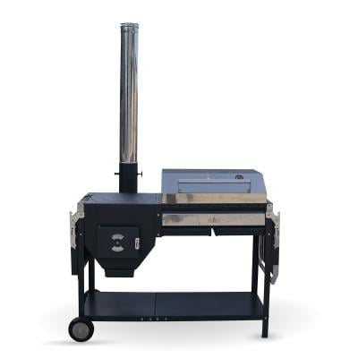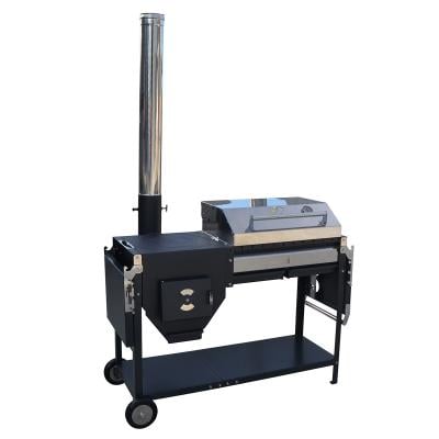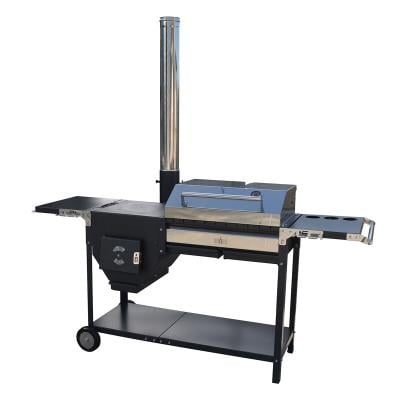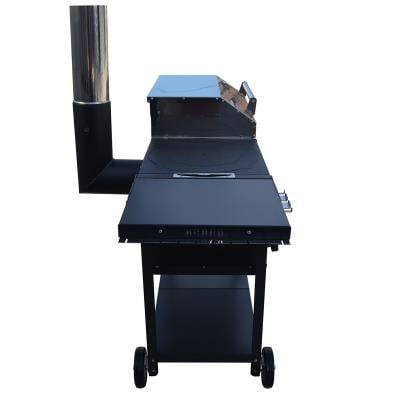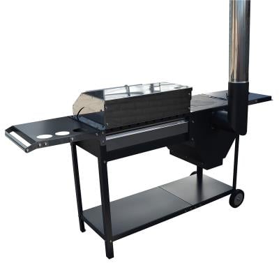 ПЕЧЬ-МАНГАЛ Premium Grill – идеальный вариант для тех, кто хочет купить мангал-печь-барбекю. Несмотря на функциональность модели, конструкция очень компактна и не займет много места на веранде. Условно рабочая поверхность разделена на две зоны: на первой – печь с отверстием под котел, на другой – жаровня с решеткой-гриль, отверстиями для шампуров и крышкой для барбекю. Вся конструкция выполнена из стали и имеет огнеупорное покрытие. По бокам находятся откидывающиеся столы, на которых можно готовить или поставить посуду. Такой мангал с печкой под котел – отличный выбор и для новичка, и для шеф-повара.