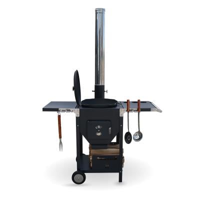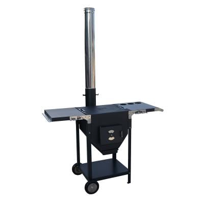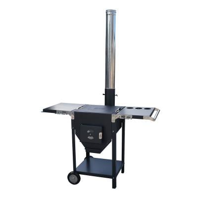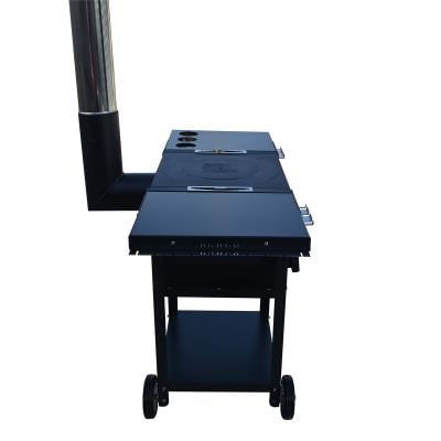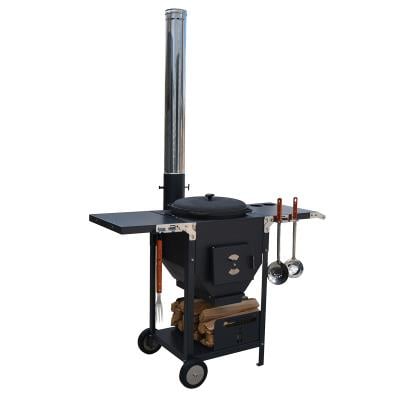 Печь PREMIUM с раздвижными столиками станет идеальным дополнением вашей веранды или беседки в загородном доме. Три кольца позволят готовить на печи в казанах разного диаметра – максимум до 390 мм, что соответствует емкости объемом 12 литров. Конструкция печи изготовлена из стали и имеет огнеупорное покрытие. За безопасность отвечают закрывающиеся двери с возможностью регулировать силу и интенсивность пламени. Также печь для дачи оборудована зольным ящиком и дымоходом, которые делают процесс приготовления более безопасным и комфортным. Два небольших колеса будут незаменимы при транспортировке печи.